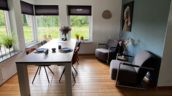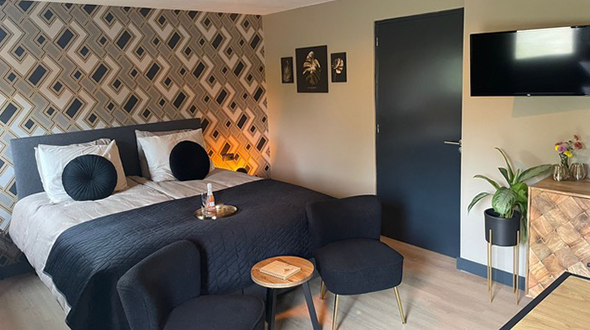 Deze ruime kamer is voorzien van een twee persoons queensize bed (zonder achterboard), een eigen badkamer, een apart toilet en een televisie op de kamer. Uniek aan deze kamer is dat er nog een extra ruimte beschikbaar is waar u (geheel privé) in de avond nog even rustig kunt nagenieten met een drankje. Deze ruimte heeft namelijk twee relax stoelen, een ruime eettafel met stoelen en een goed gevulde koelkast. Het ontbijt wordt in deze ruimte geserveerd in de ochtend.